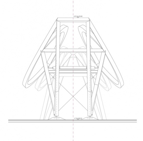 该项目位于以色列南部城市贝尔谢巴,连接了高科技园区以及Beer-ShevaTzafon火车站(以及Ben-Gurion大学),于2016年年6月12日正式投入使用。该钢制步行桥跨度180米,横跨在城市轨道交通站点之上,仅通过三个V型钢柱支撑。这种极简的支撑体系之所以可行,得益于桥体鱼眼式的双曲线结构造型,它可以通过抵抗水平应力来增强结构的强度,同时也可以为穿行其中的行人带来动态和变化的行走体验。